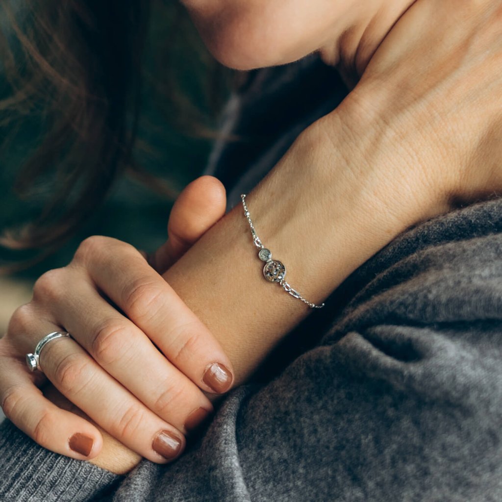 The delicate bracelet from the DOUBLE DROP collection is made of sterling silver filled with two sands of your choice.