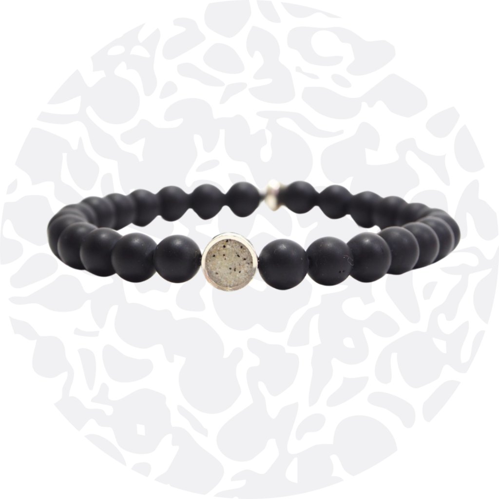 Matte onyx beads with a diameter of 8 mm are combined with a solid silver bead filled with sand of your choice. The sand drop measures 9 mm, giving your memories enough space to stand out.