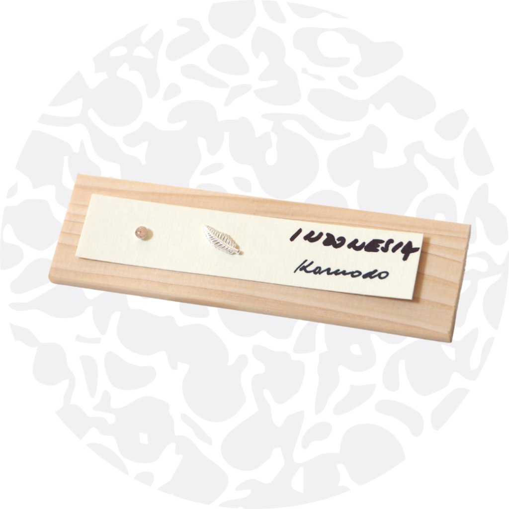 The earrings are presented on a wooden display card with a hand-written label and come with silicone backings. You can also choose silver or gold-plated backings.