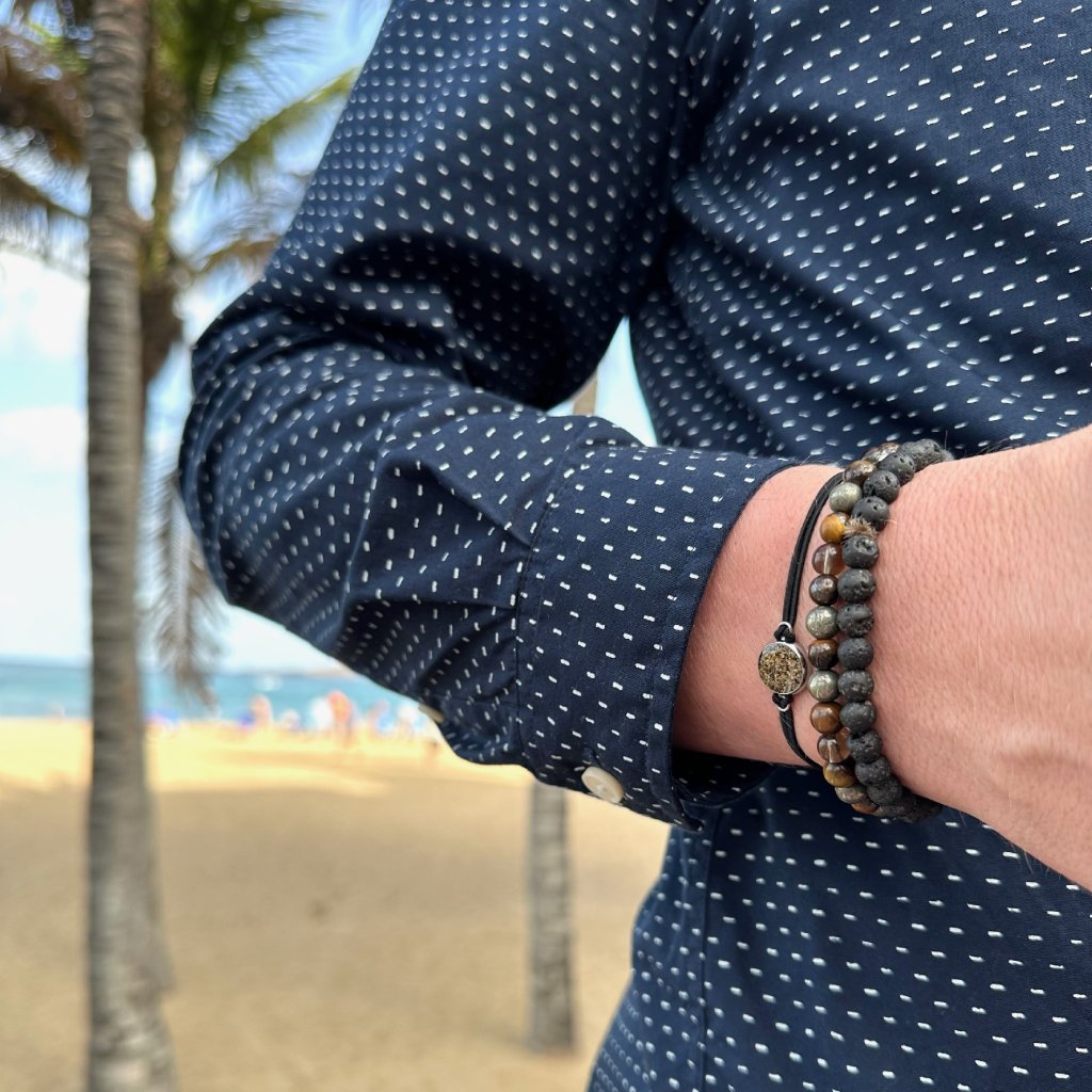 V hlavní roli tohoto náramku je kapka s pískem. Můžete si vybrat ze dvou velikostí 7mm a 10mm. I když je 7mm stále decentní velikost, tak nabízí dost místa, aby každé zrnko písku vyniklo. Ve velikosti 10mm pak písek dostává prostor opravdu zaujmout a hodí se i na hrubší zrnka, nebo třeba větší kousky lastur a lámaných mušlí.