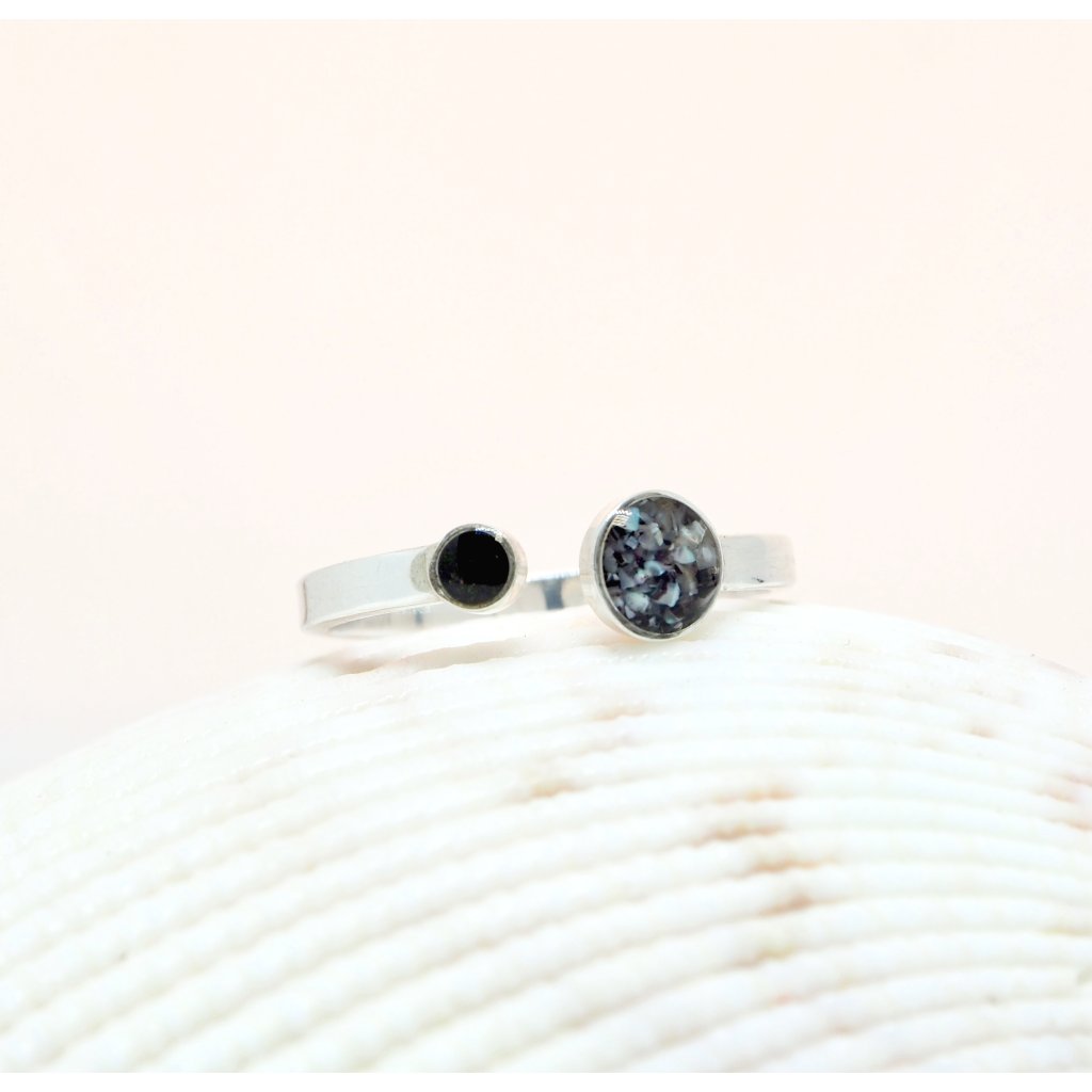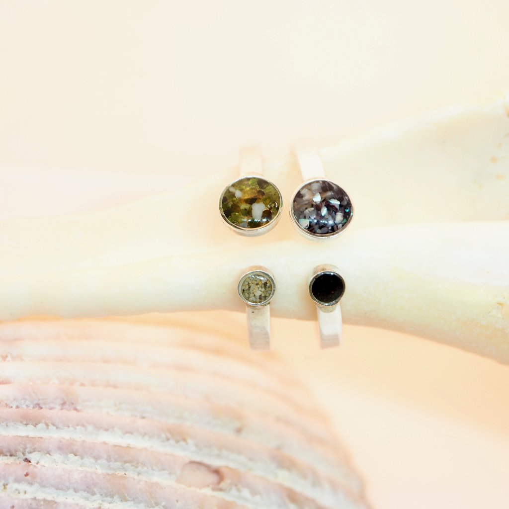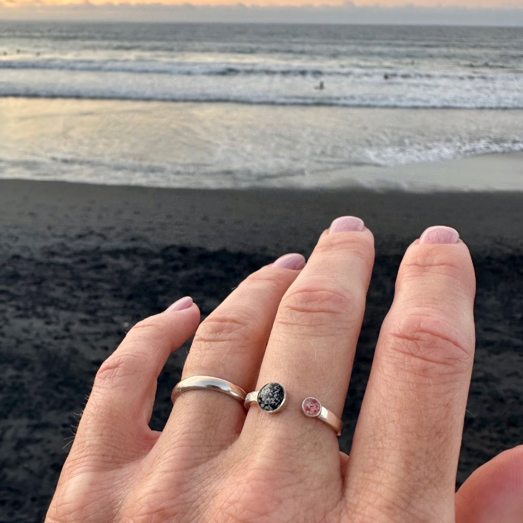 Prstýnek je navržen v decentním a jemném designu a kapky na písek mají 5mm a 2mm. Proto do nich lze použít jen jemný materiál jako zrnka písku, nebo jemně drcené mušle. Pokud si nejste něčím jistí, ozvěte se nám.