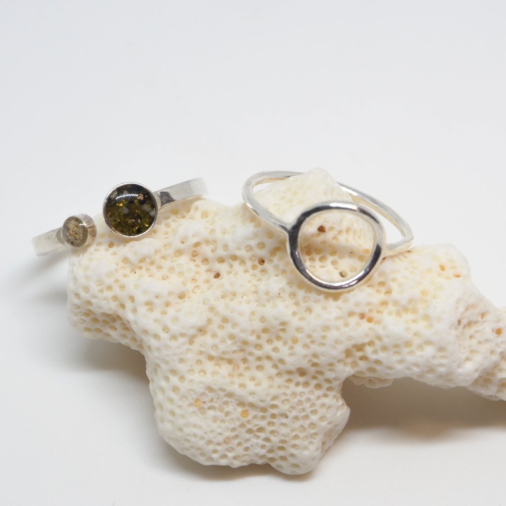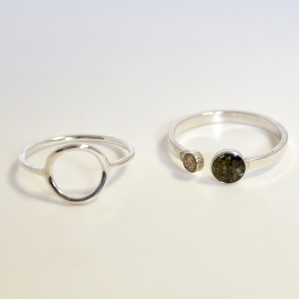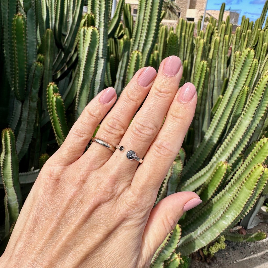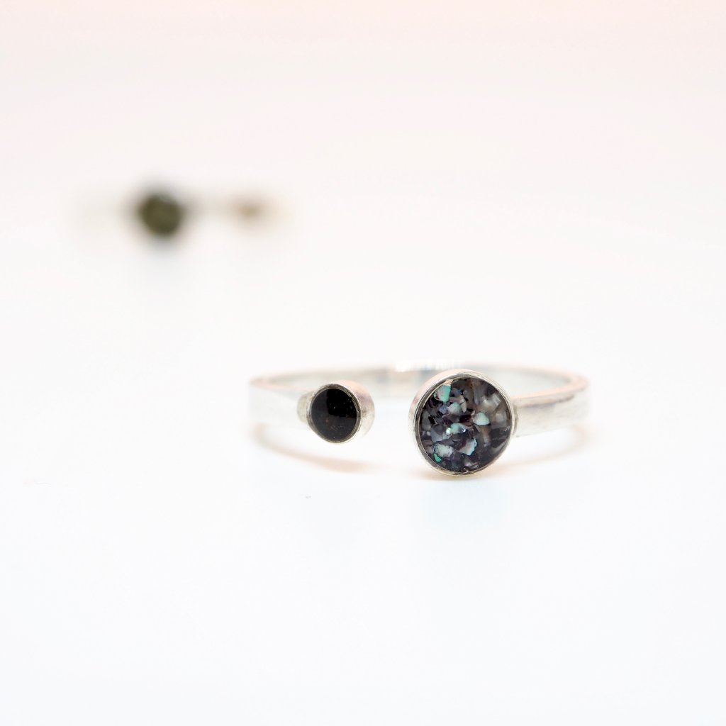 Prstýnek je navržen v decentním a jemném designu a kapky na písek mají 5mm a 2mm. Proto do nich lze použít jen jemný materiál jako zrnka písku, nebo jemně drcené mušle. Pokud si nejste něčím jistí, ozvěte se nám.